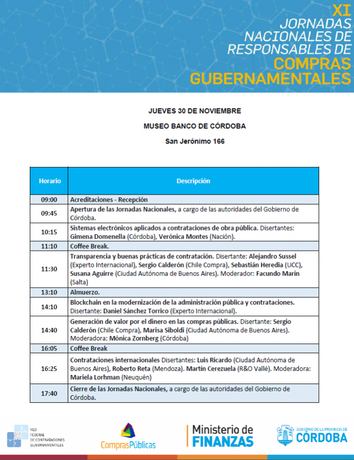 La Dirección General de Compras y Contrataciones organiza y expone, entre otros, los días Jueves 30/11 y Viernes 01/12 en la «XI JORNADAS NACIONALES DE RESPONSABLES DE COMPRAS GUBERNAMENTALES».